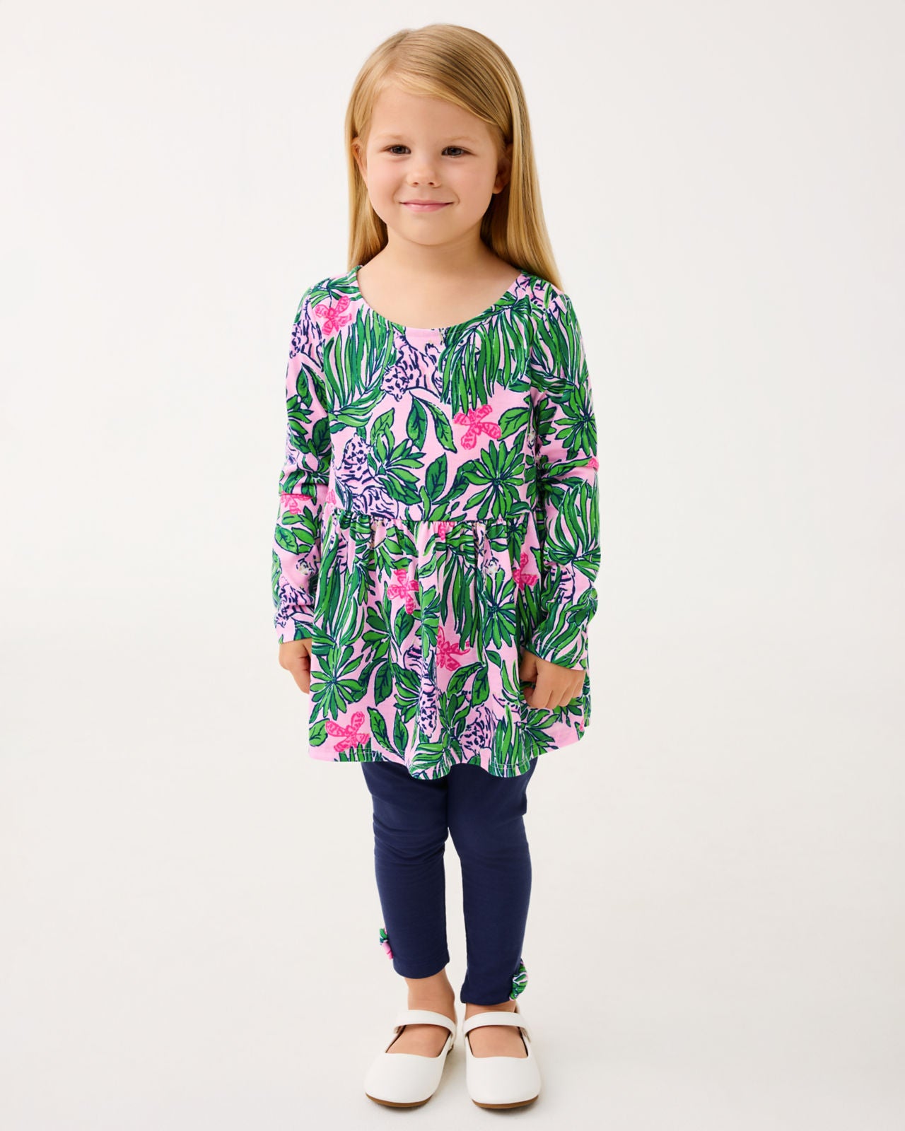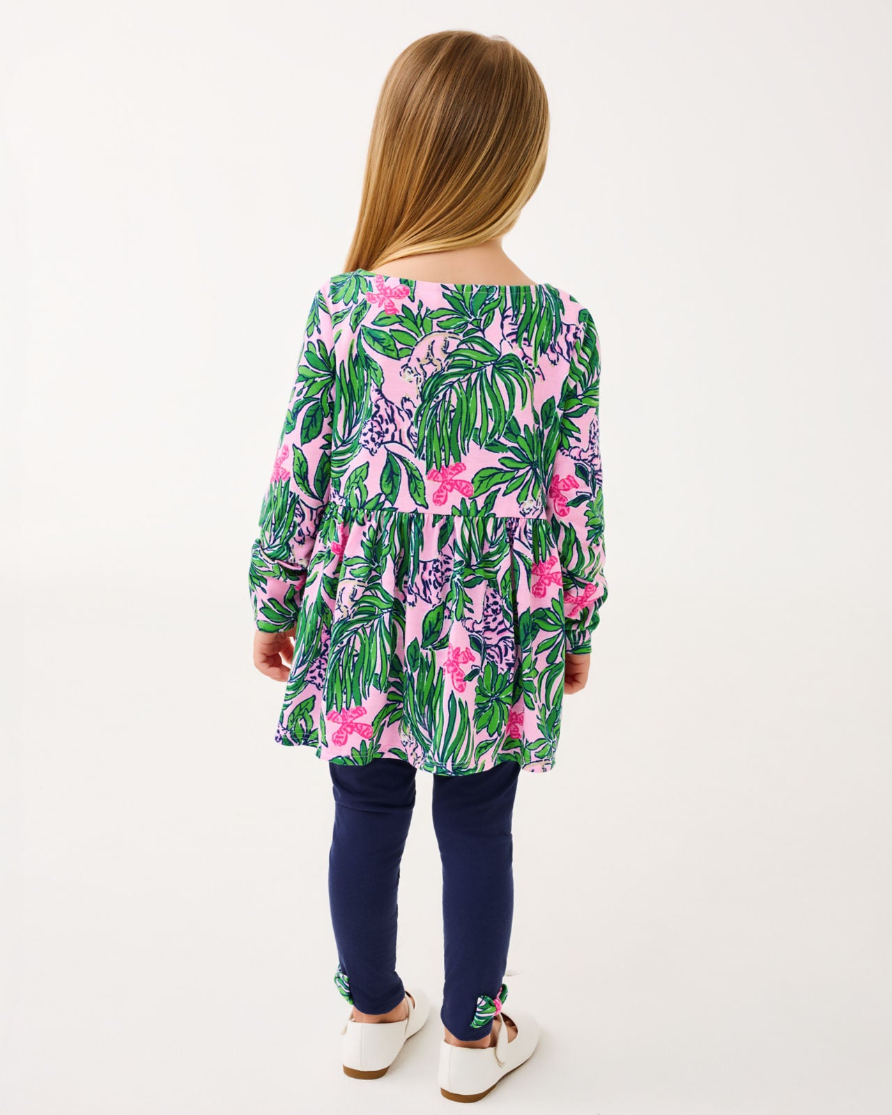 Easy fit, tunic top with long sleeves, peplum flounce and wide neckline. Coordinating pull-on legging with hem bows.