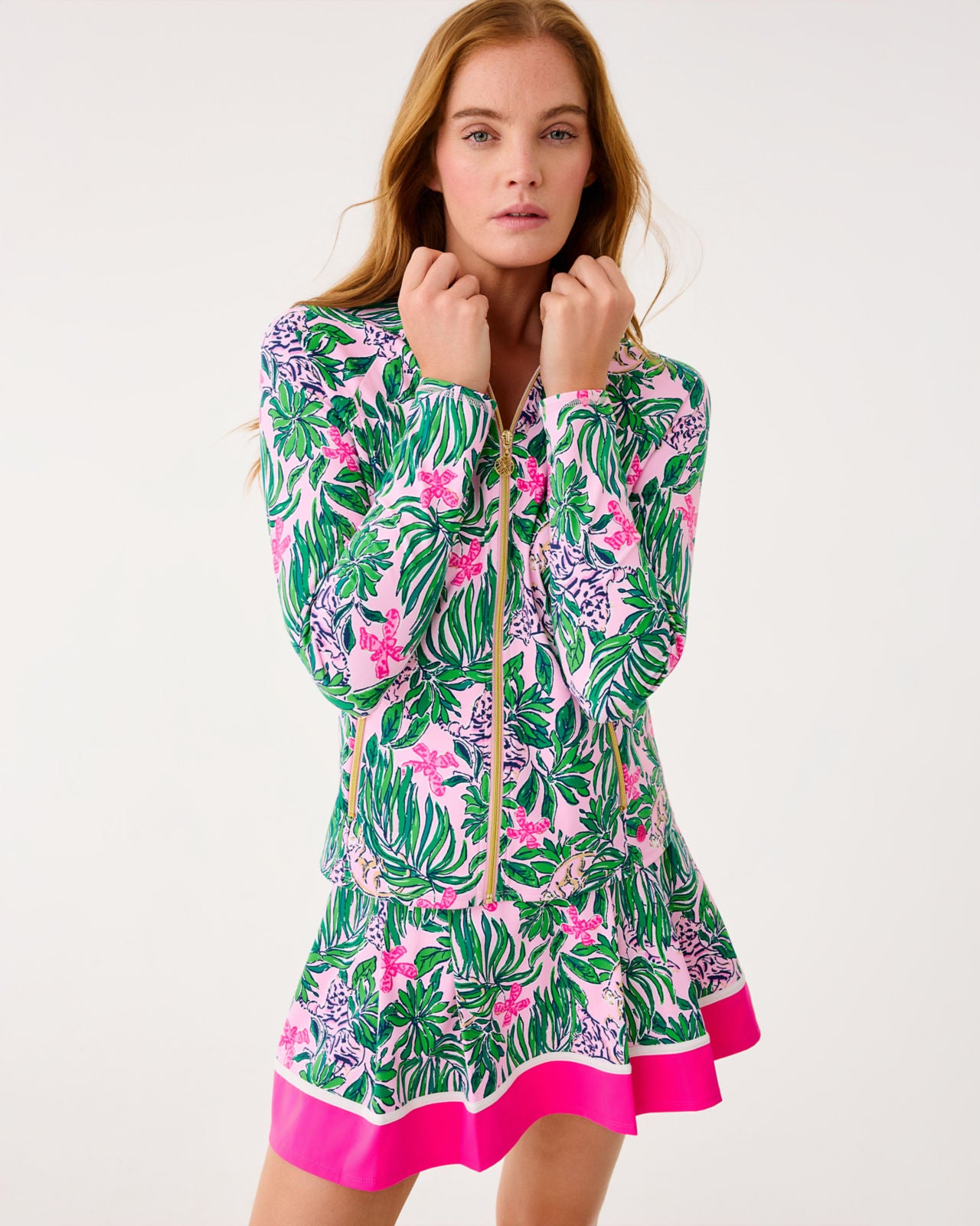Luxletic 15" high-rise pleated active skort with contrast fabric piecing and pocket on undershort. UPF 50+, Moisture Wicking, Partially Recycled Material.