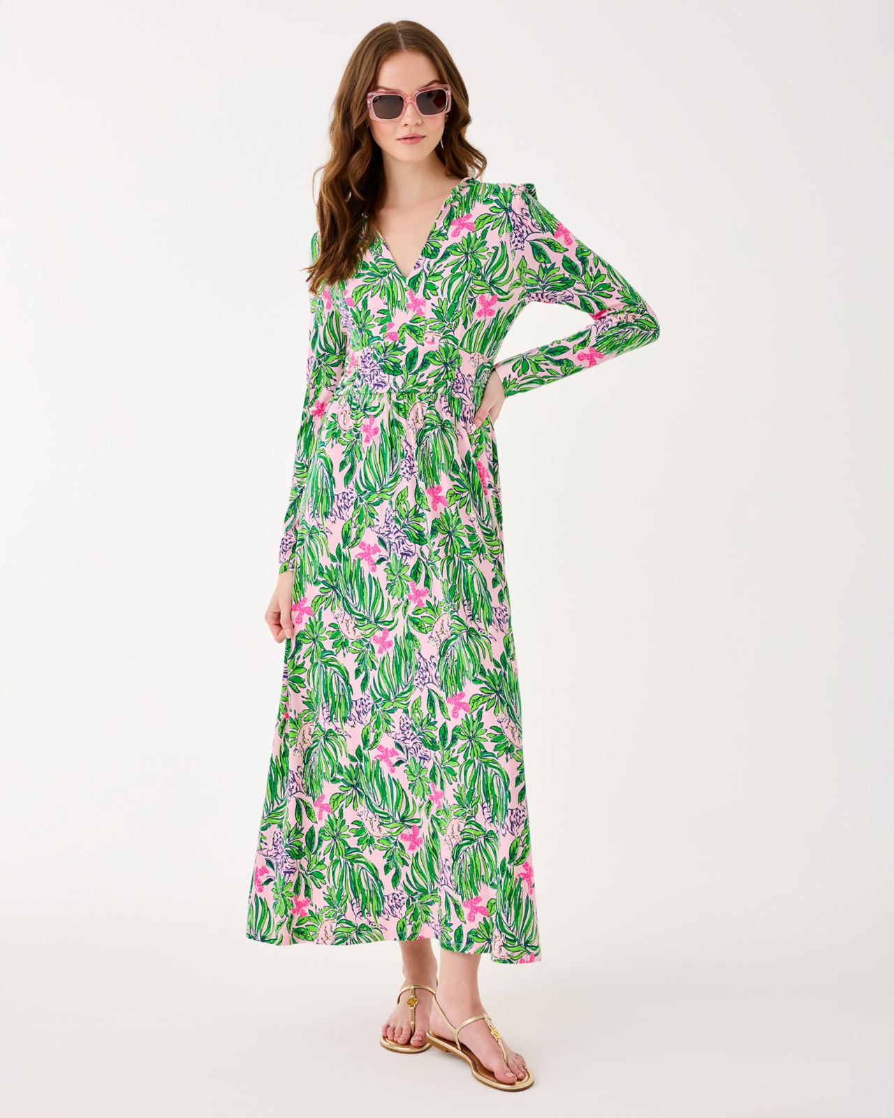 37" Fit and flare dress with stand collar and notch neckline, ruched waistband, and long sleeves