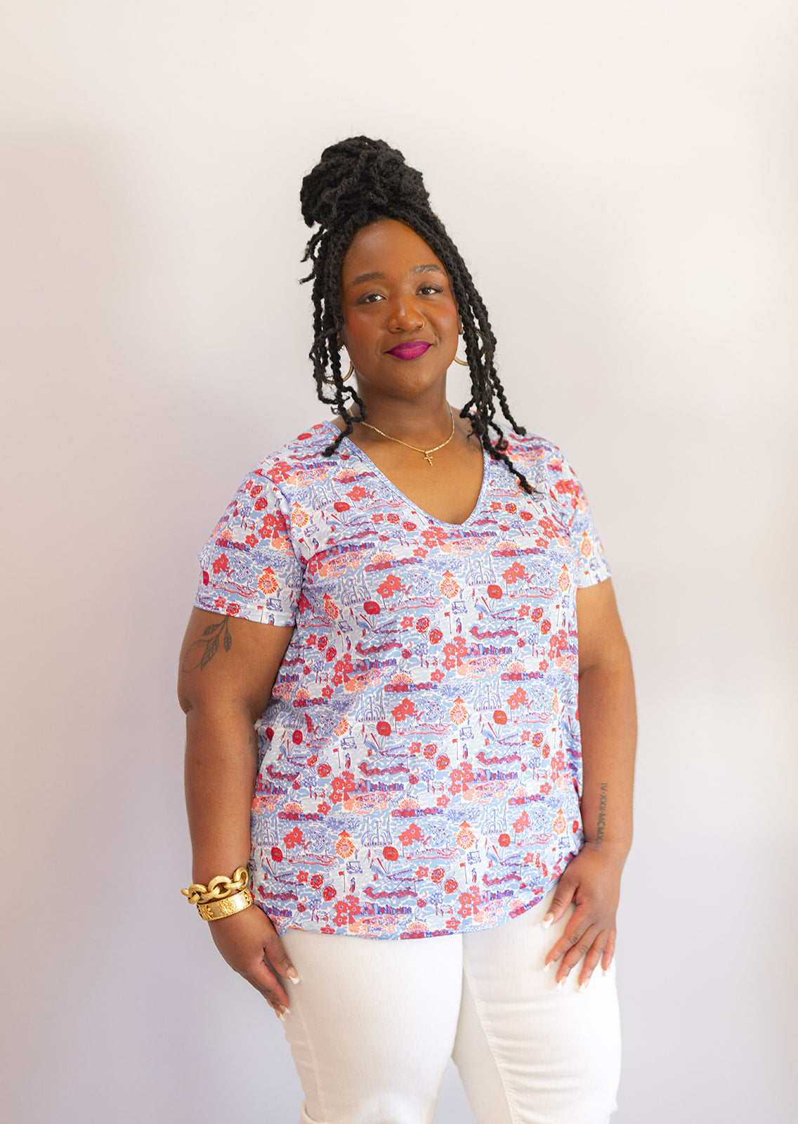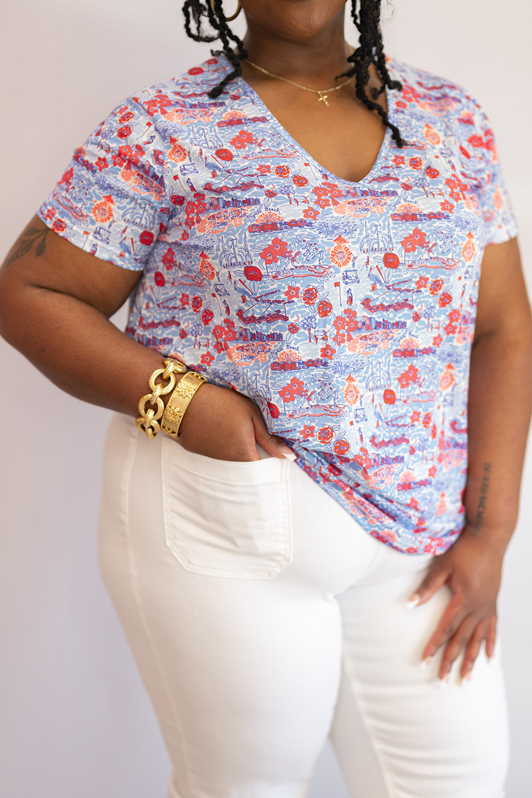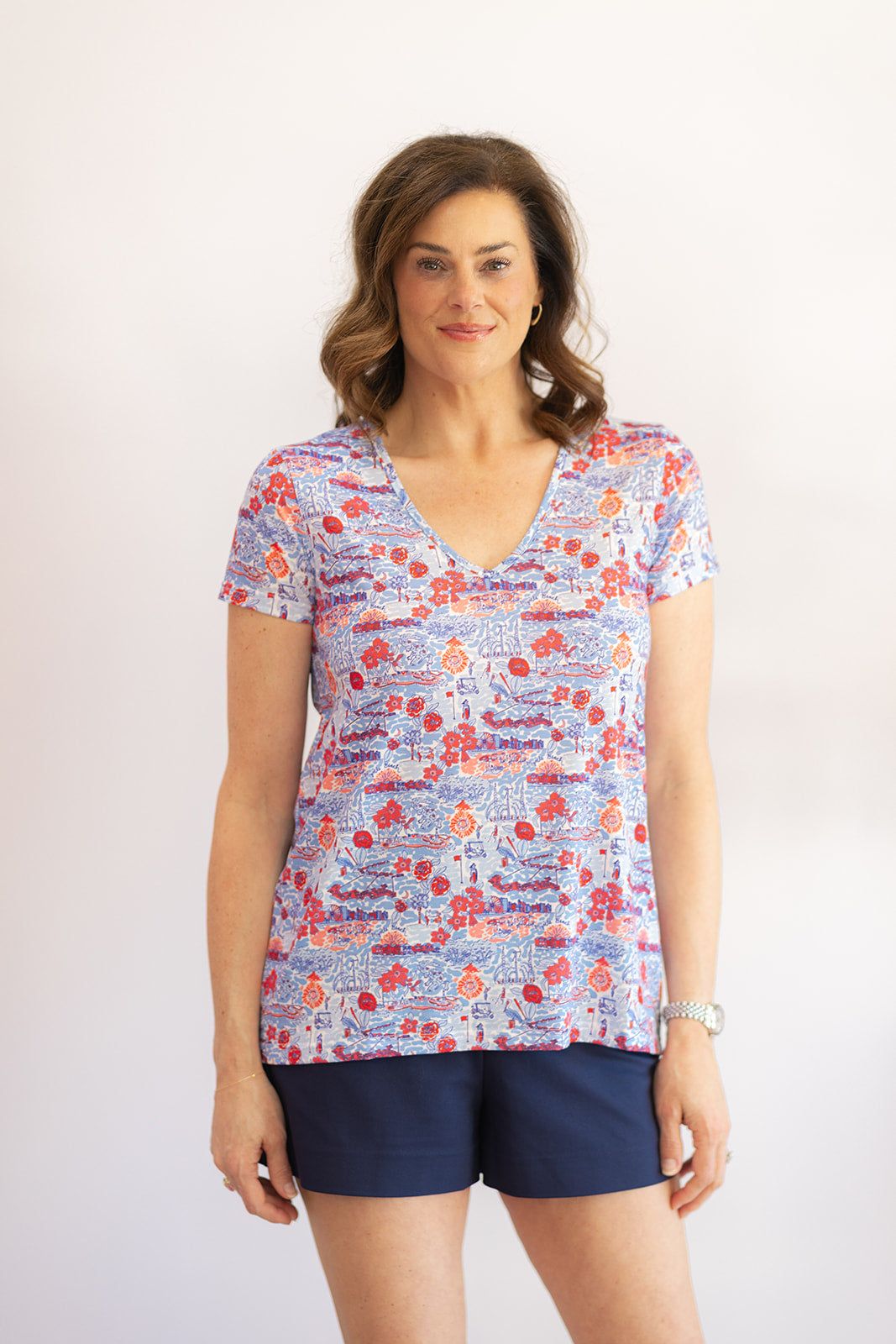 Women's lightweight, short sleeve V neck t shirt with a loose fit. Constructed in a cotton-feel jersey knit fabric. This is an exclusive print design sold only at Pink & Red.