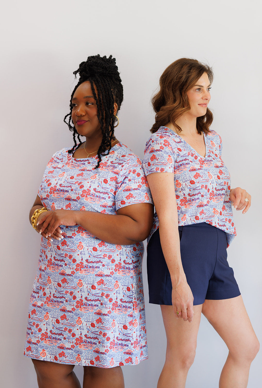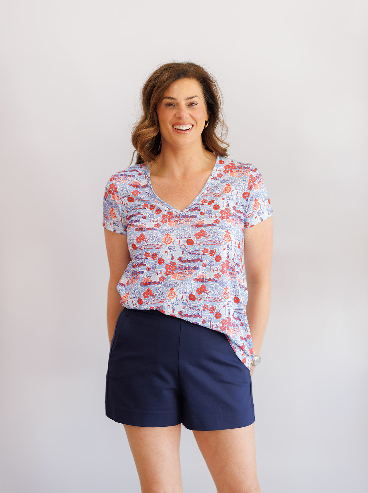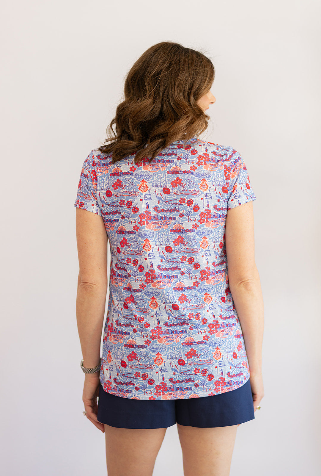 Women's lightweight, short sleeve V neck t shirt with a loose fit. Constructed in a cotton-feel jersey knit fabric. This is an exclusive print design sold only at Pink & Red.