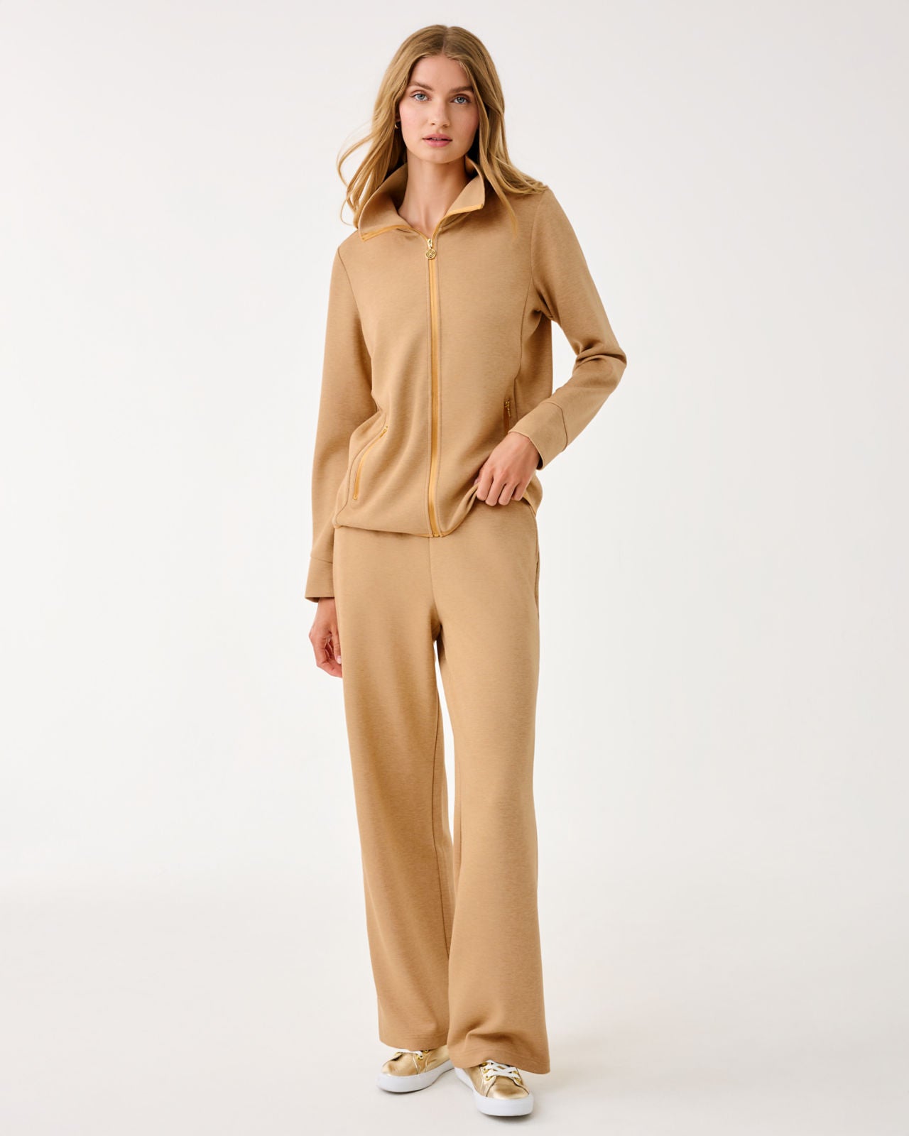 30.5" Inseam, high-rise, machine washable Serene Soft Knit pant with front pockets and drawcord detail. UPF 50+
