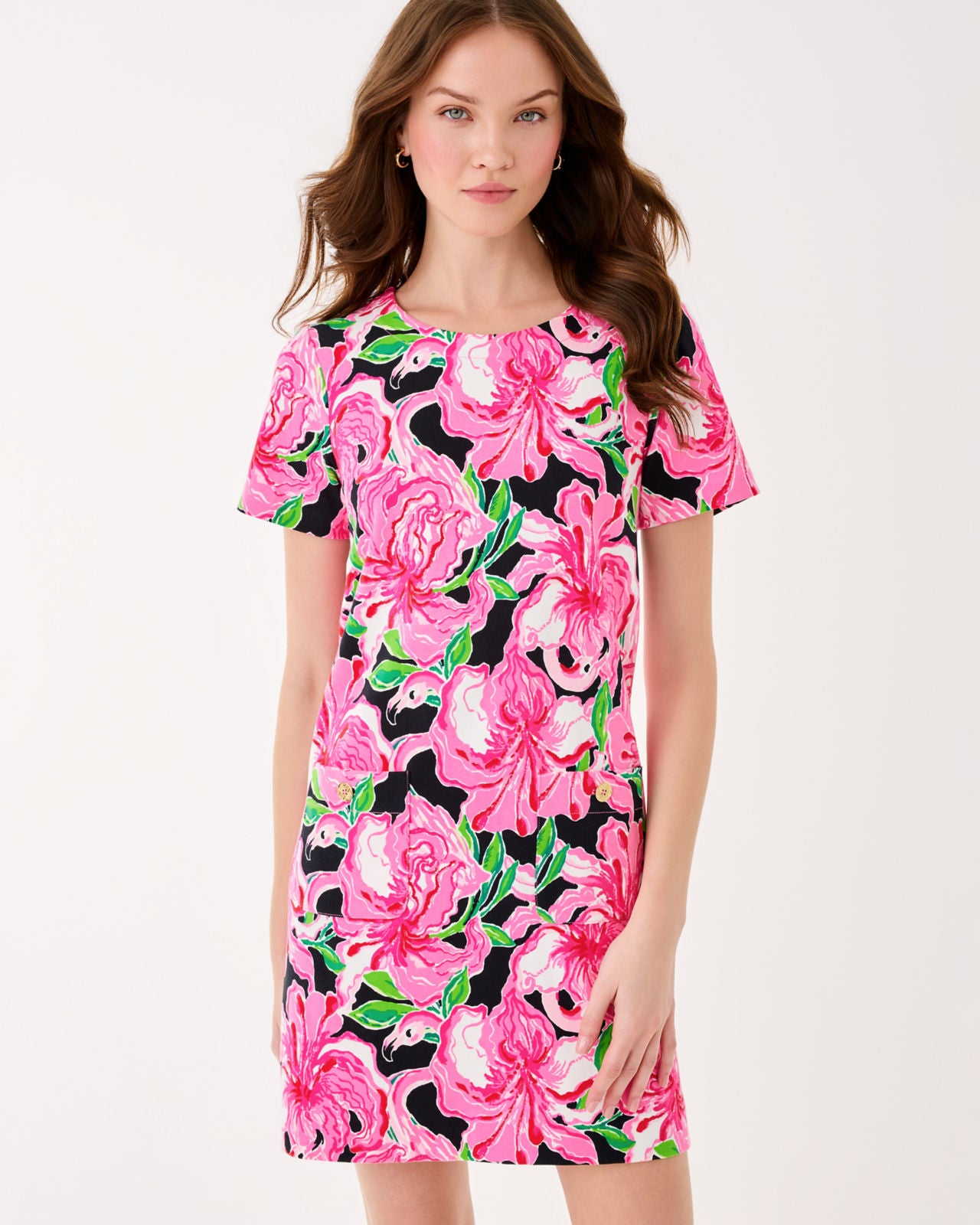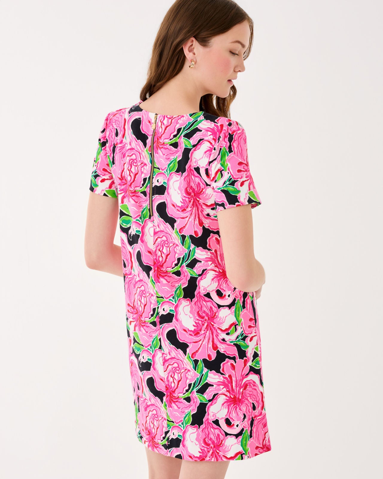 19" Easy fit, shift dress with crew neckline, short sleeves, gold button detail at shoulder and pockets, and exposed back metal zipper