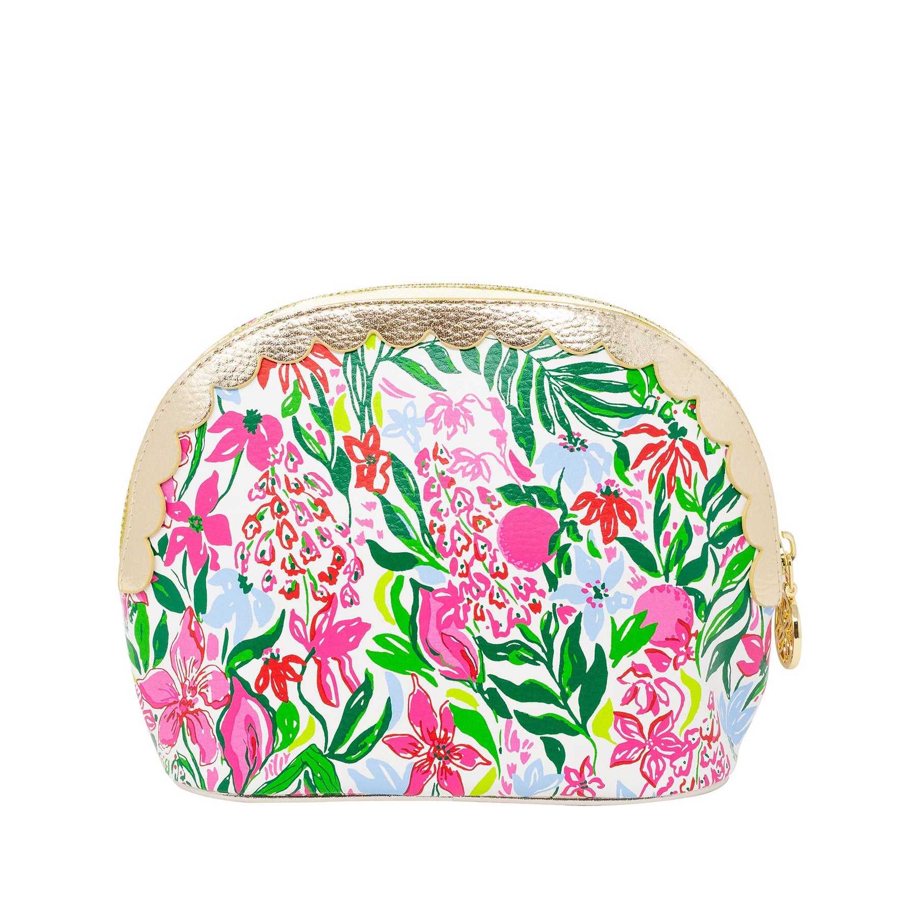 Add a splash of coastal charm to your everyday essentials with this small pouch set in the patterns Glowing Gardens and Feeling Poppy. Featuring a beautifully textured leatherette exterior and a smooth polyester interior, this petite pouch is as practical as it is polished. The flat base gives it structure for easy standing, while the delicate scallop trim adds a touch of breezy elegance. Finished with a gold zipper closure and a signature logo zipper pull, they are perfect for stashing makeup, travel essentials, or small treasures on the go. Whether tossed in a beach tote or displayed on your vanity, this pouch set brings coastal flair wherever it goes.