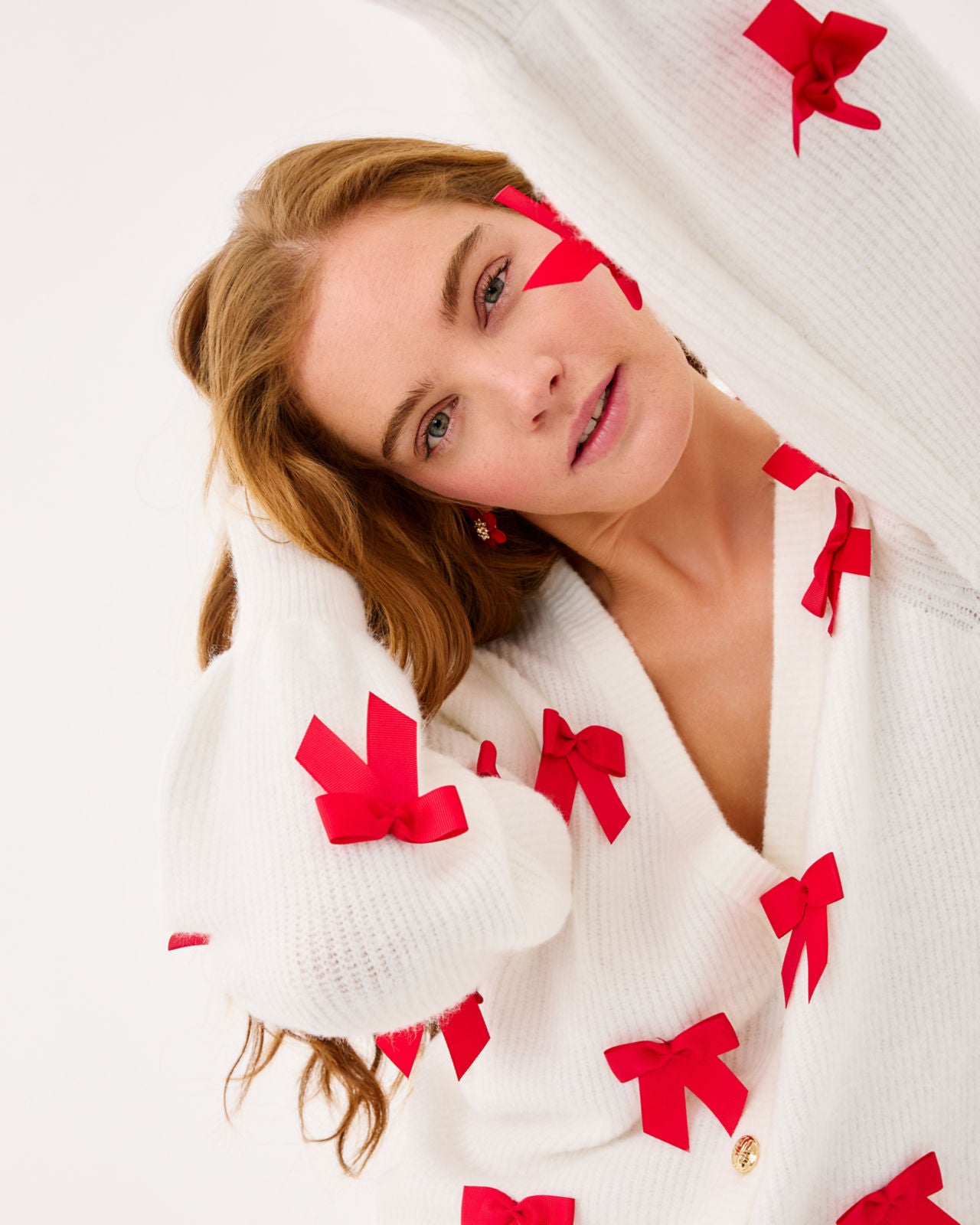 24" Straight Fit â LS v neck cardigan with puff blouson sleeves, x5 buttons and tossed bow detail
