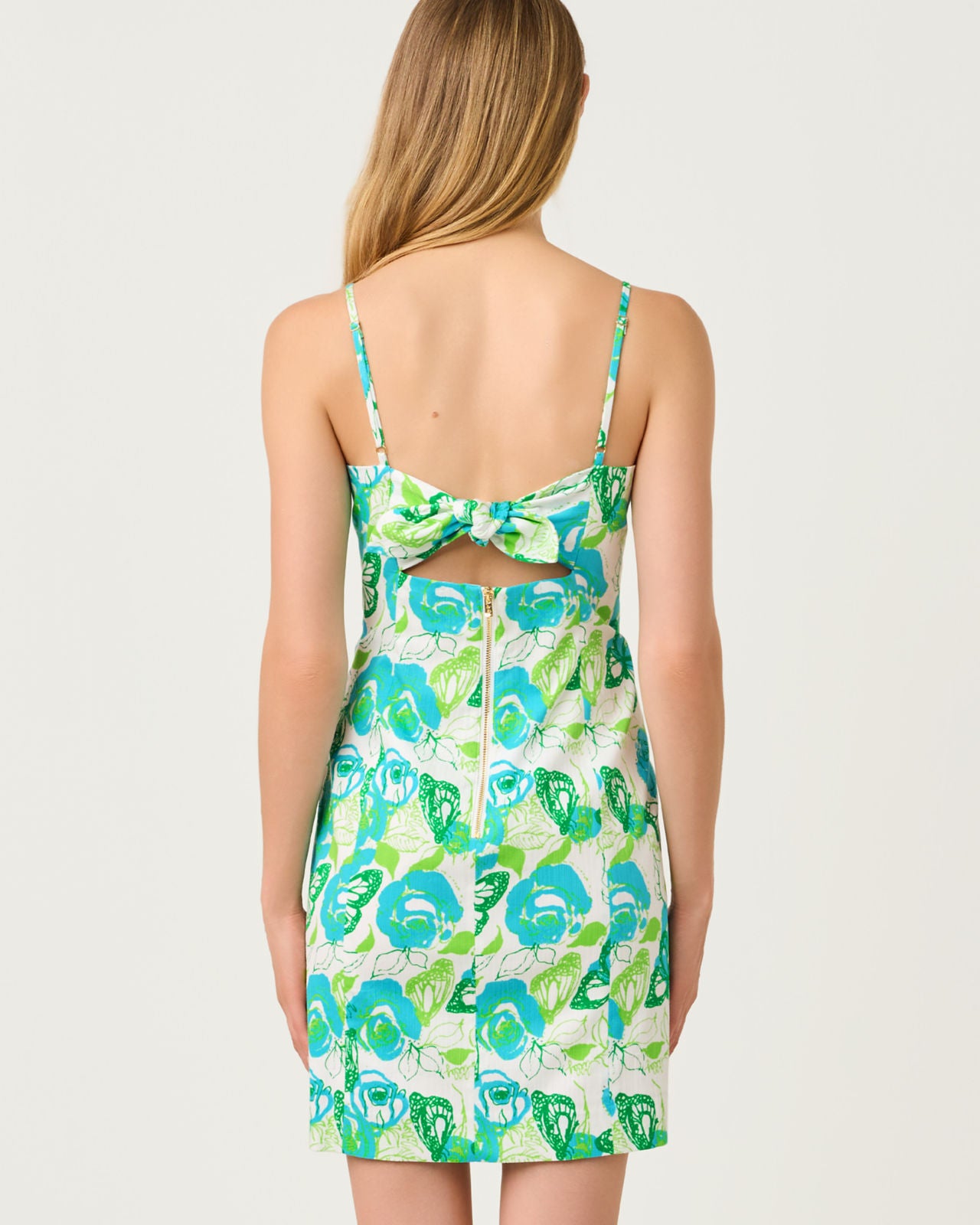 19" Fitted dress with adjustable spaghetti straps, bodice cups, functional tie back detail, exposed back metal zipper, and Lilly lace trim