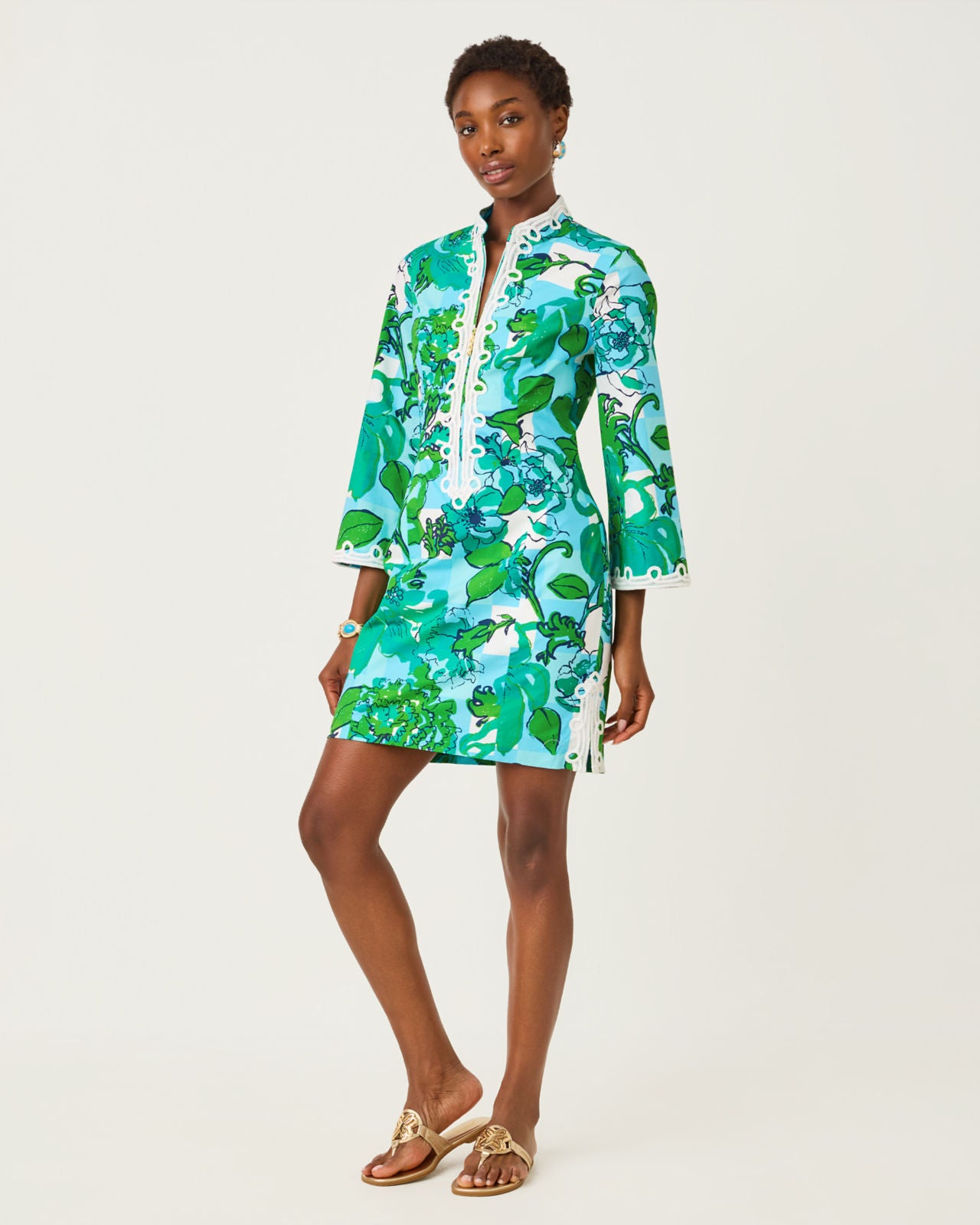 | 20" Fitted dress with stand collar, zip-front neckline with gold bamboo pull, 3/4 length bell sleeves, side slits, and Lilly lace trim |