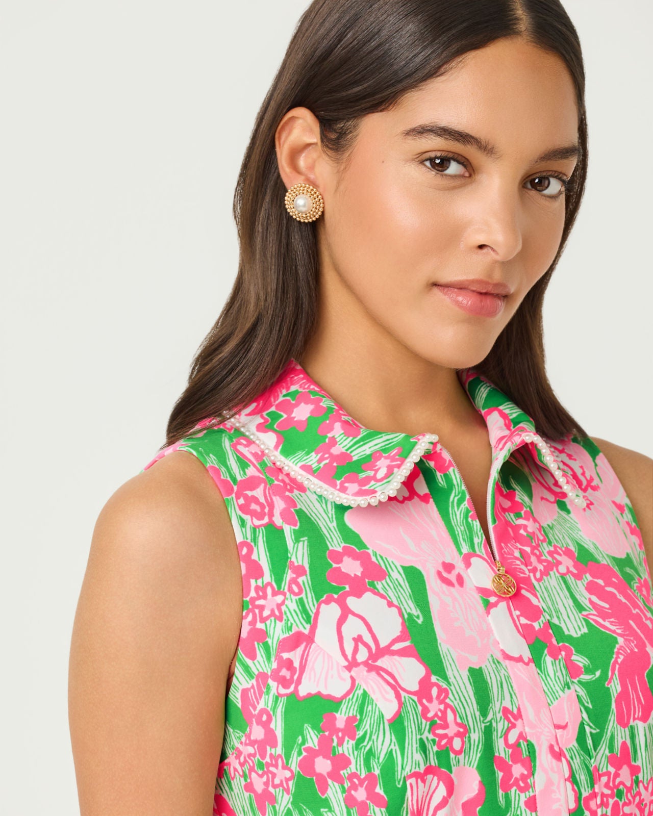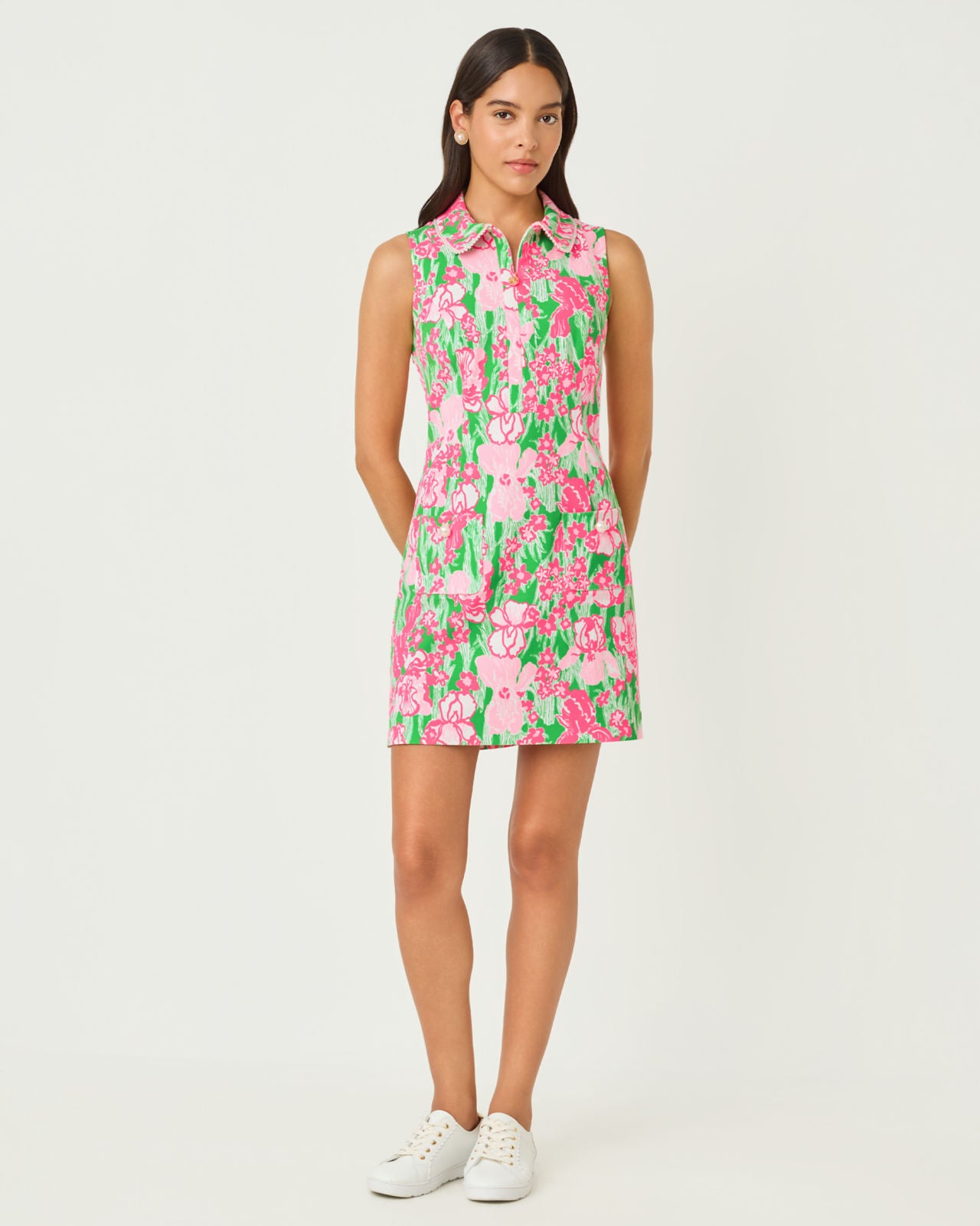 Luxletic stretch woven, zip-front, golf dress with pearl detail, front pockets, and separate jersey undershort with pocket. UPF 50+, Moisture Wicking. 18" from natural waist