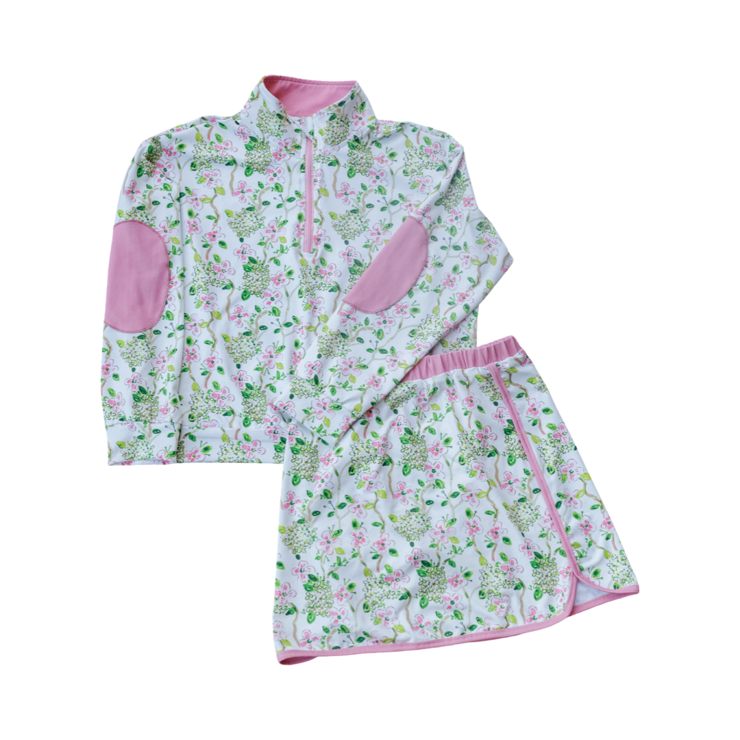 Turn heads on and off the court with the Charlotte Set in Dogwood by Evelyn Henson. Designed with movement, comfort, and confidence in mind, this two-piece set features a playful quarter-zip pullover and a coordinating athletic skirt — perfect for school, sports or weekend adventures.