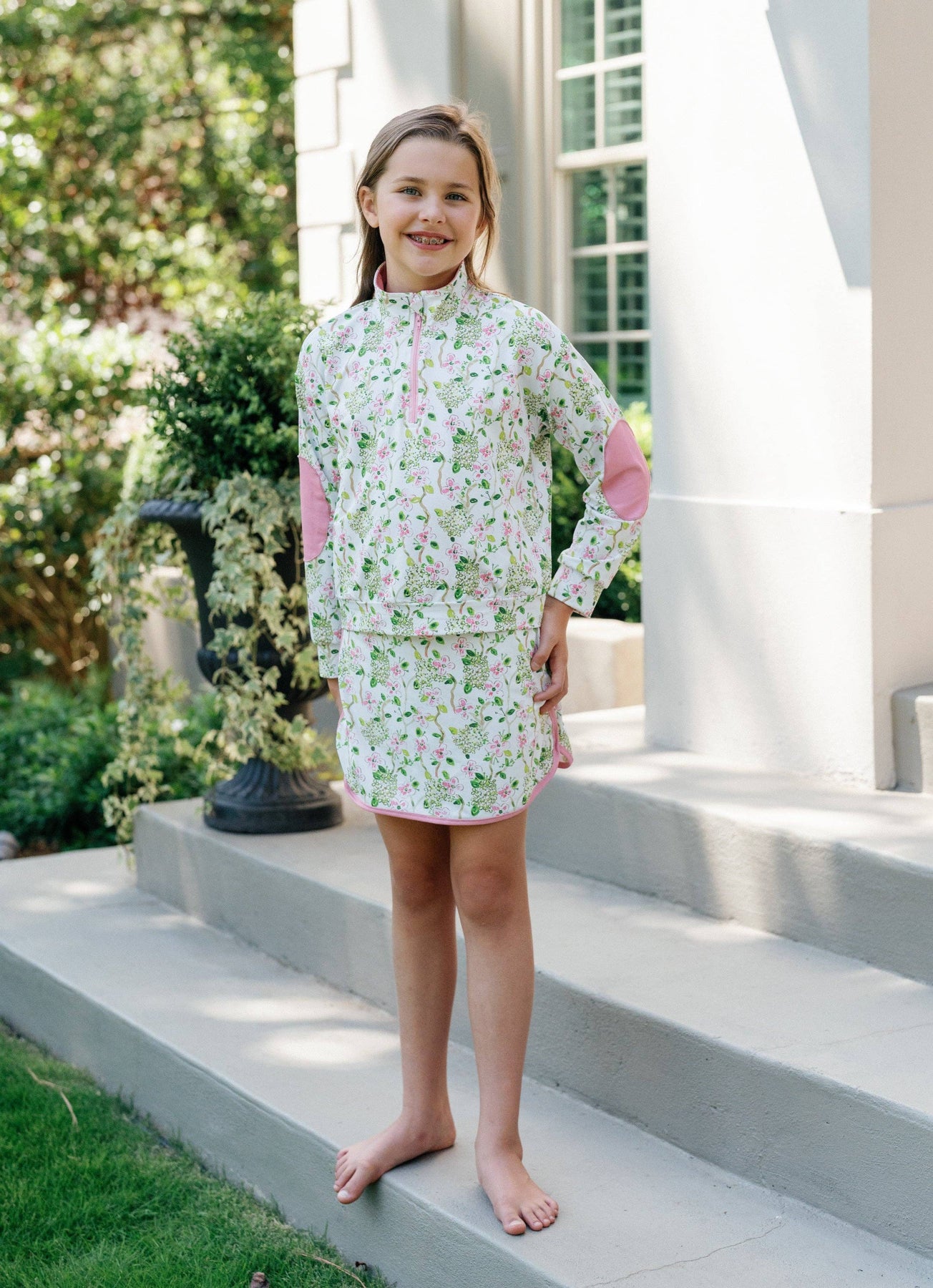 The eye-catching pink and green blossom print is full of personality, with floral vines and leafy details. With a sporty twist, the set is finished with soft pink accents on the collar, zipper, elbow patches, waistband, and skirt trim — giving it just the right pop of personality.