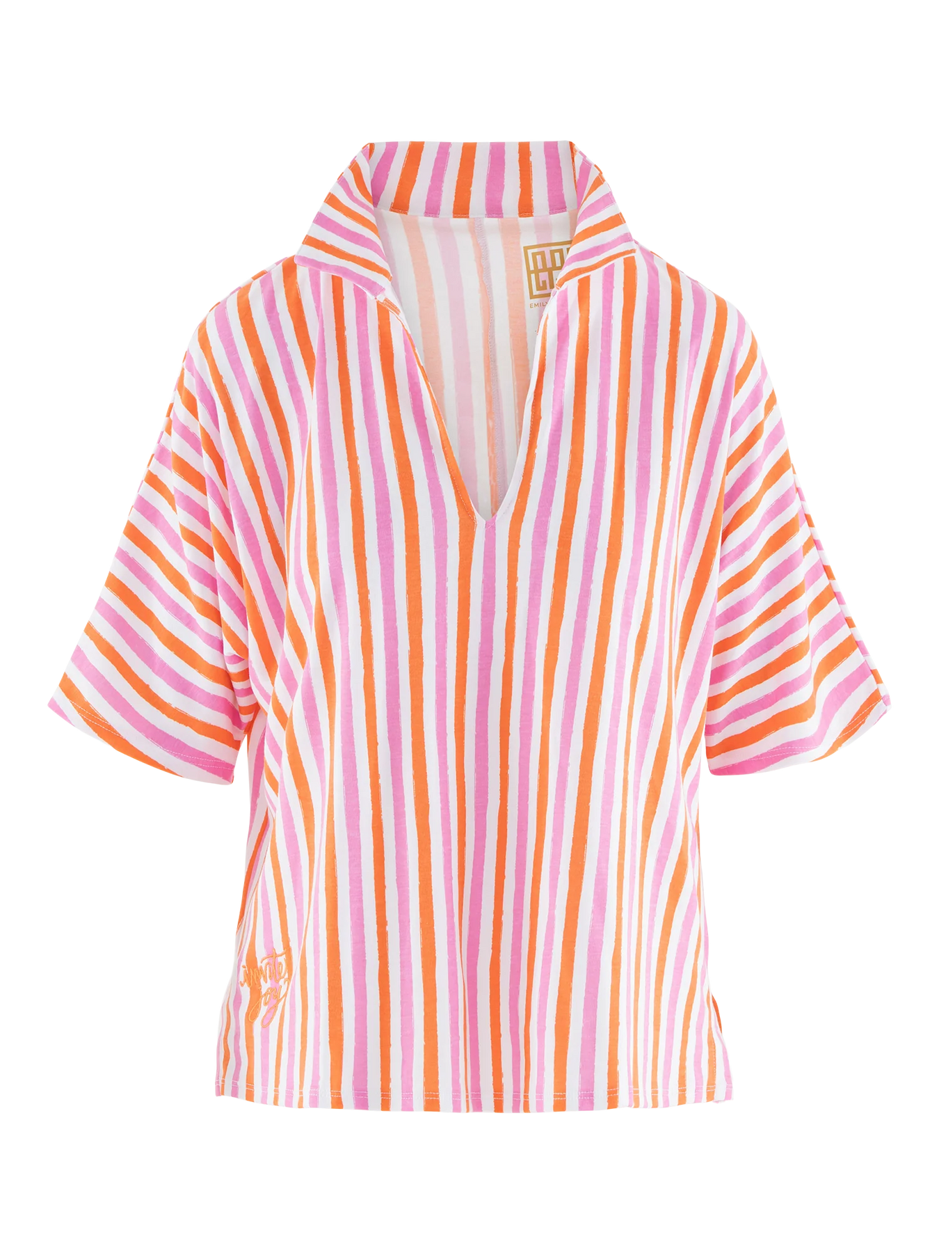 Our PJ Short Set in Coral Pink Stripe brings comfort and charm to your downtime. The top features a classic stand collar, relaxed dolman sleeves, and a loose, easy silhouette. The matching shorts have a soft elastic waistband and a relaxed fit—perfect for a cozy night’s sleep into slow mornings. Painterly coral and pink stripes vary in scale for a playful twist, while our signature “invite joy” embroidery on the bottom corner adds the finishing touch.