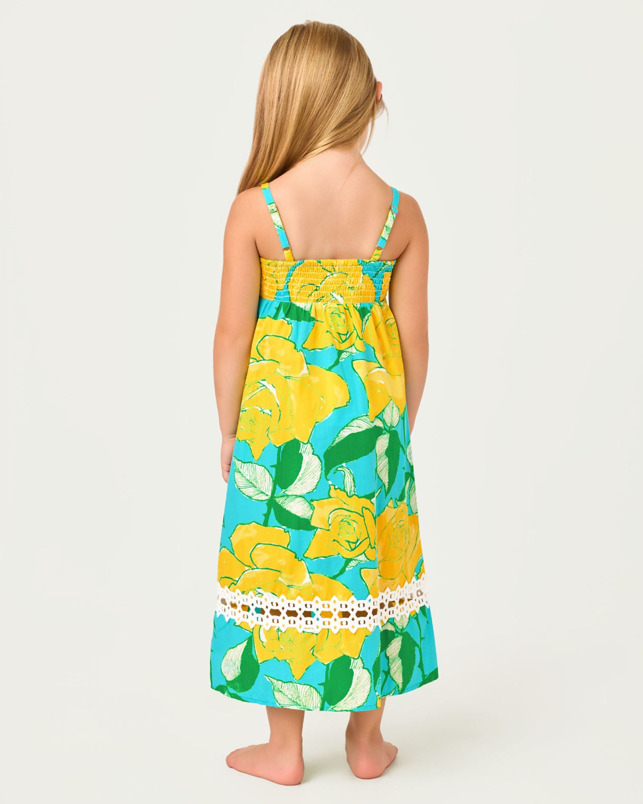 Fit and flare midi dress with adjustable straps, lining, back smocked bodice, sideseam pockets and Lilly lace trim.