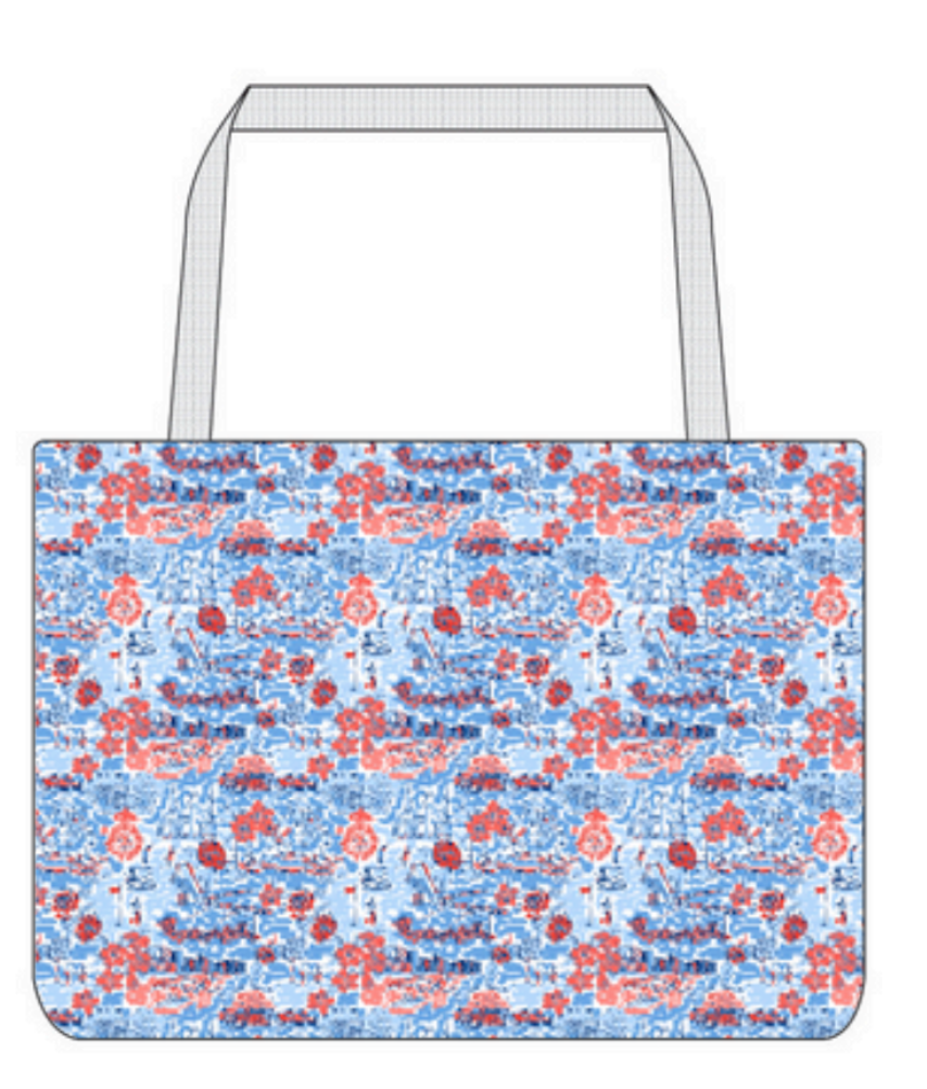 Water resistant synthetic canvas tote with cotton canvas lining. White cotton web handles with brass zipper closure. Inside pocket for added storage. Item can be personalized with embroidered monogram or name/phrase.