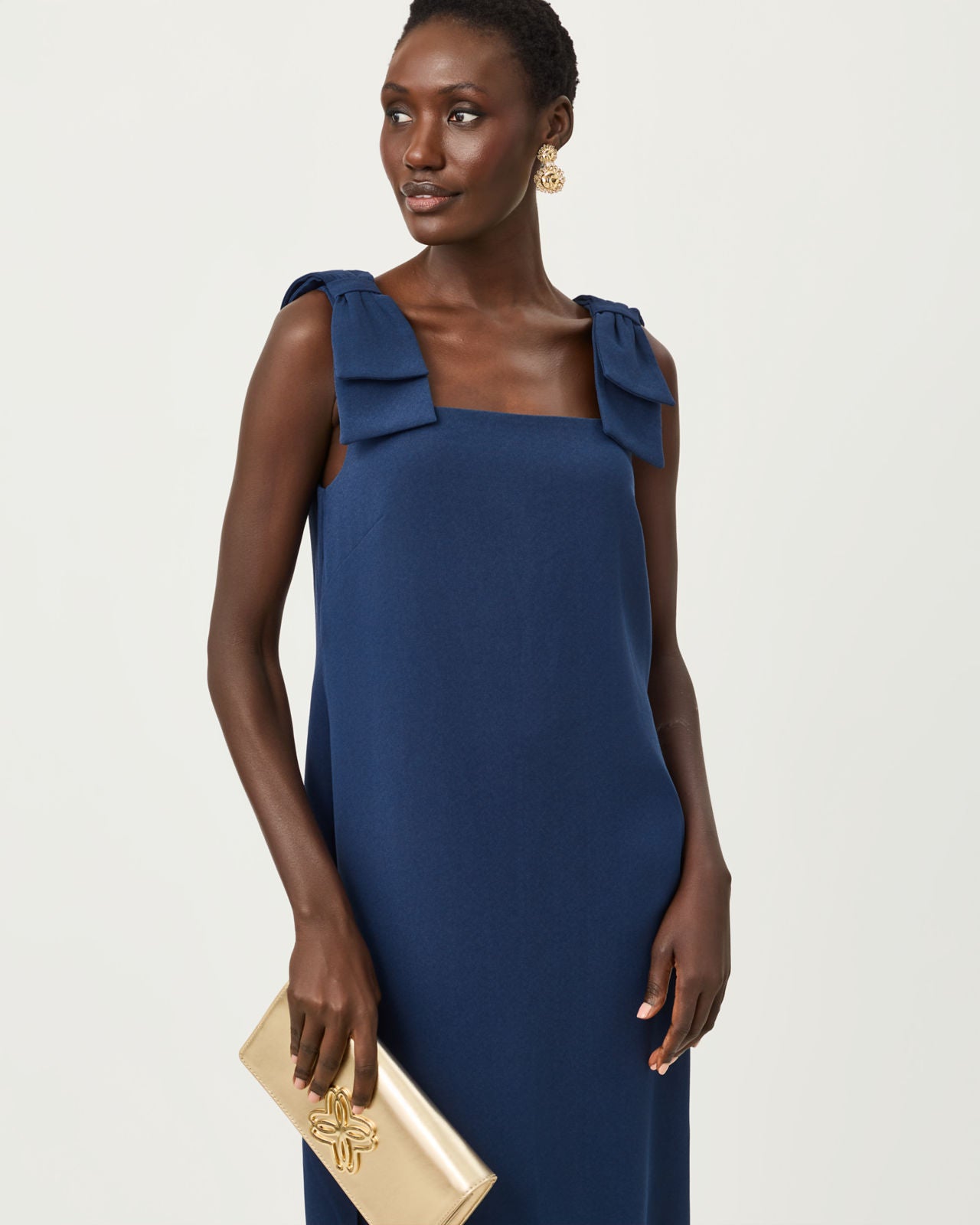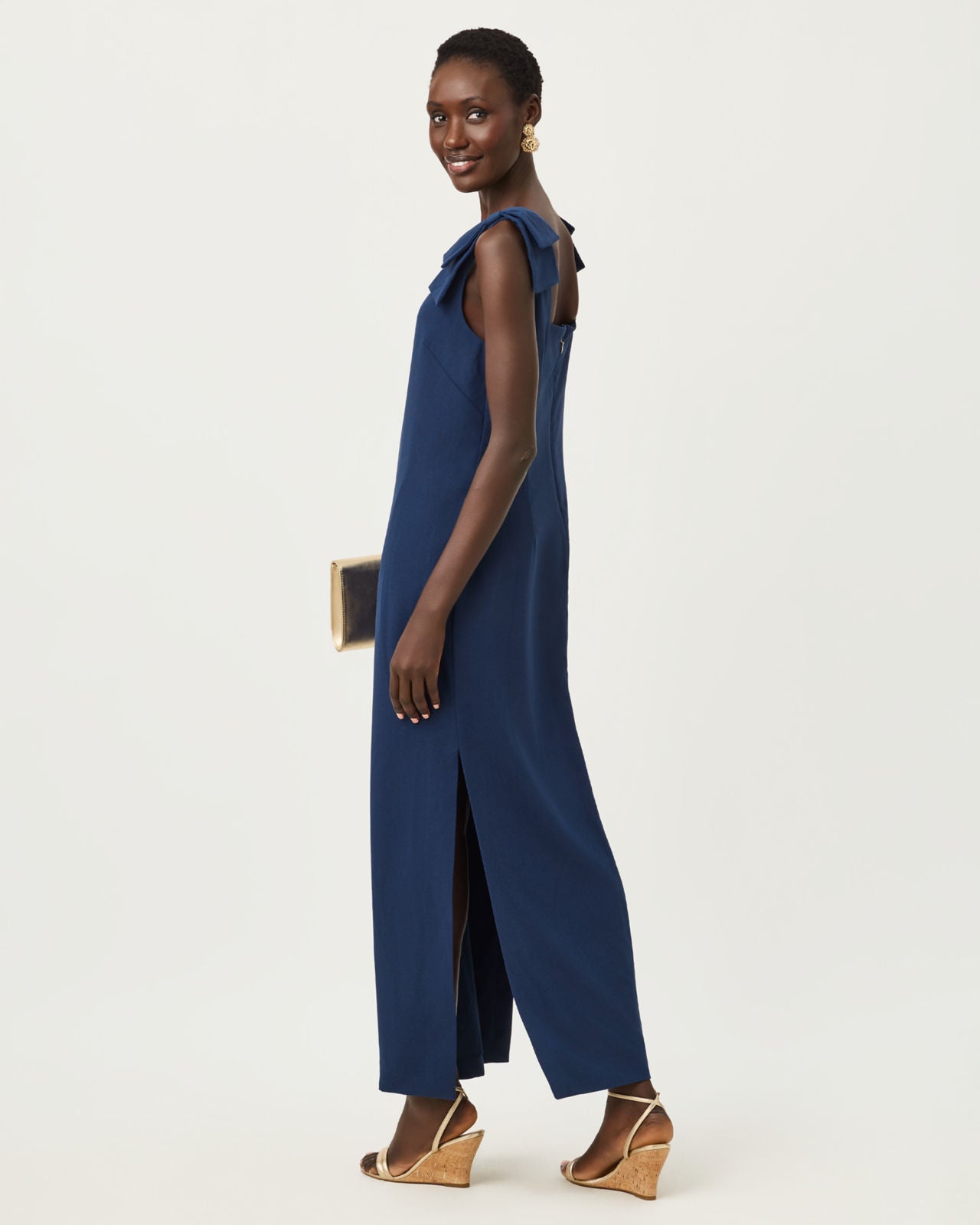41" Straight fit, bra-friendly, flats length maxi dress with bows at shoulders and side slits