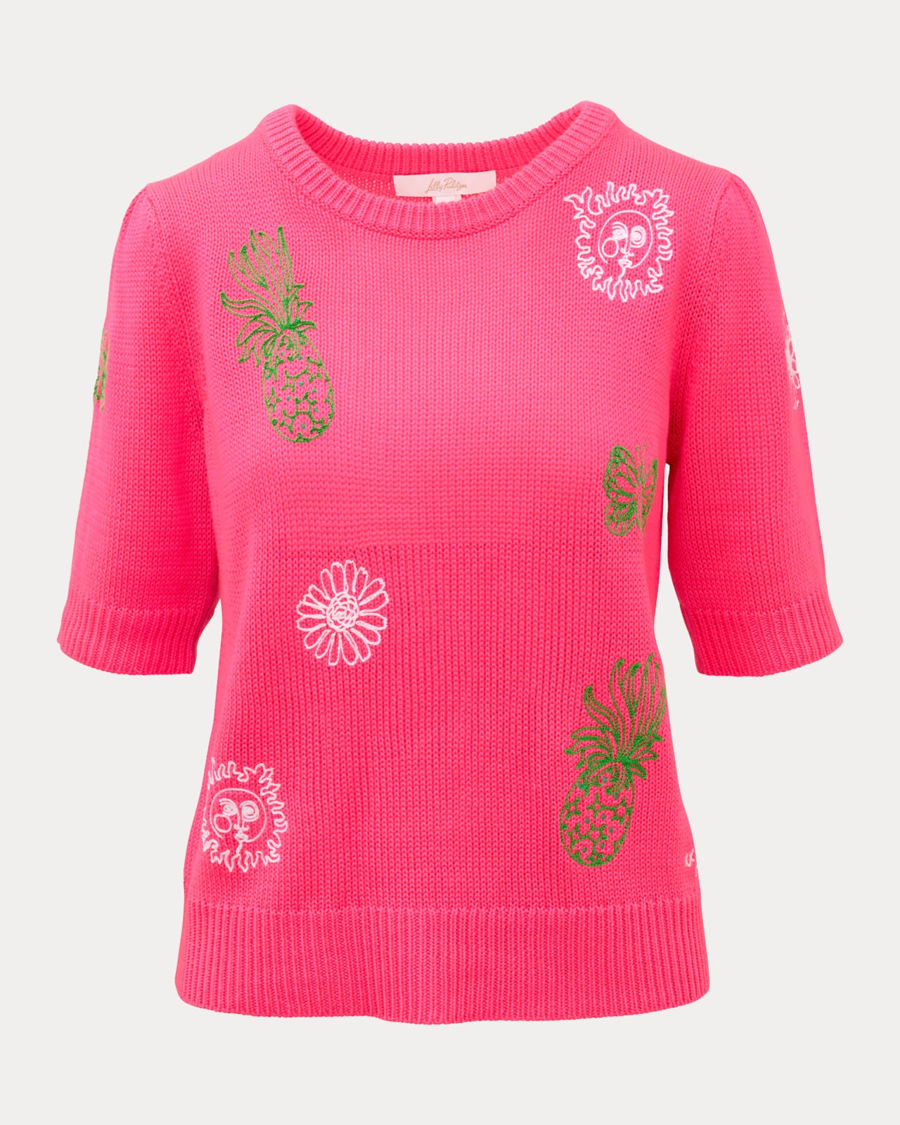 23" Straight Fit crewneck sweater with shirred sleeves and tossed embroidery motifs